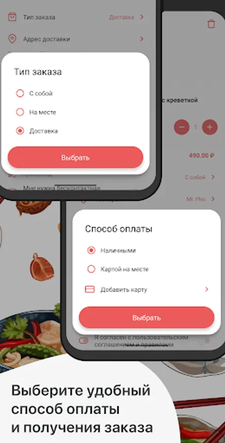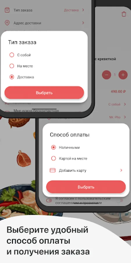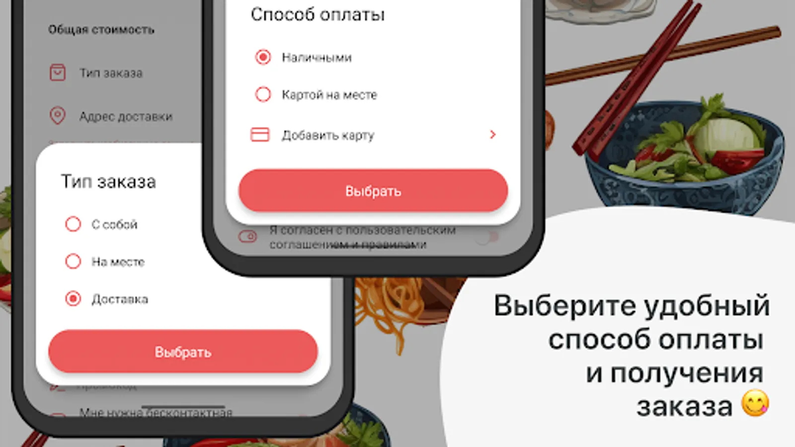 Specify the time when you want to come to pick up your order or select delivery with the indication of the time and delivery address.