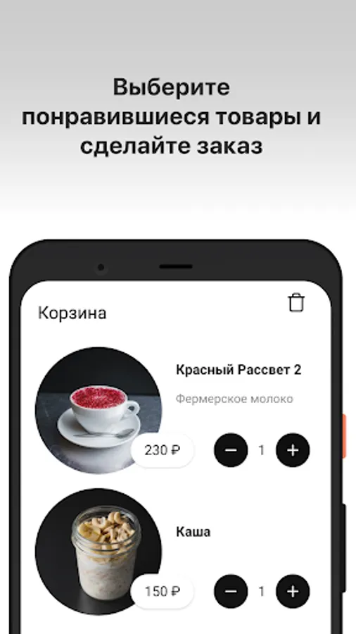 How to order in the annex "OIL": select your favorite items from the menu, add them to your cart and proceed to checkout screen (by pressing the trash icon).