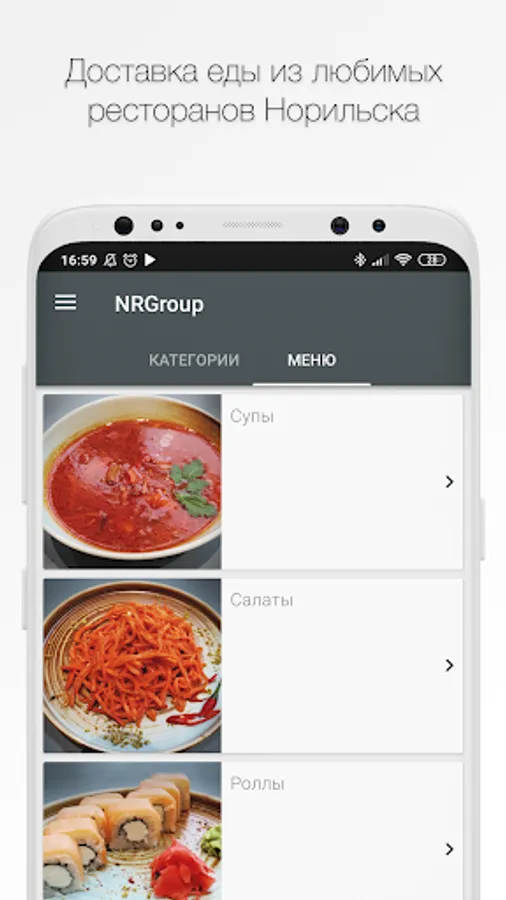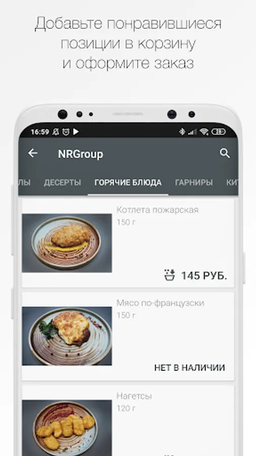 How to place an order in the “NRGroup” application: select the items you like from the menu, add them to the cart and go to the checkout screen (by clicking on the cart icon).