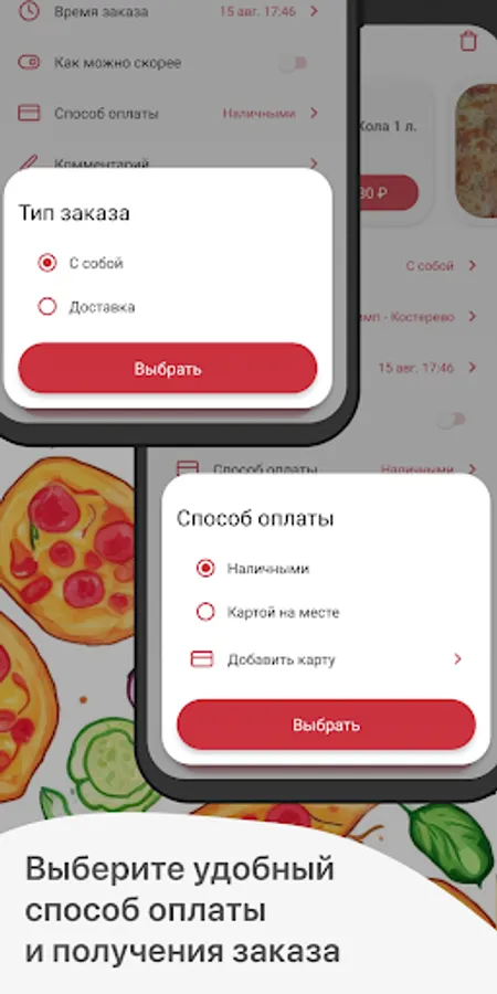 Specify the time when you want to come to pick up your order or select delivery with the indication of the time and delivery address.