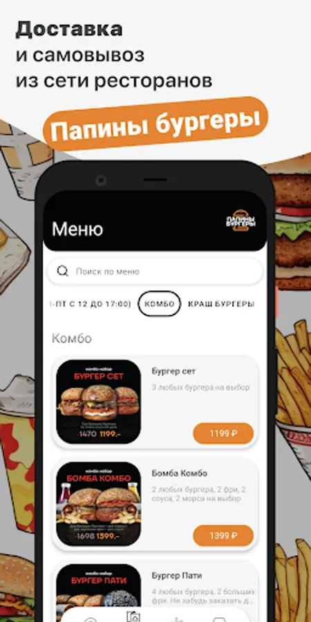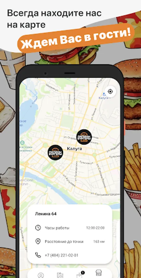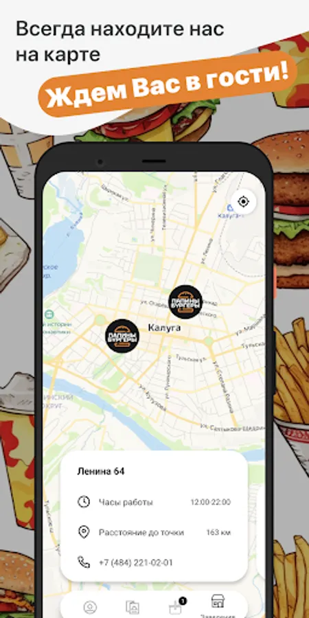 We are burger experts in Kaluga. We fry powerful and juicy gourmet burgers according to original recipes! We roll cutlets from marbled beef, and we bake buns ourselves every day. And to make you really happy, we keep more than 200 types of craft in our refrigerators. Remember the main thing: Dad will feed everyone!