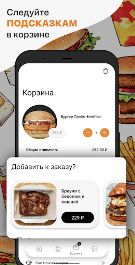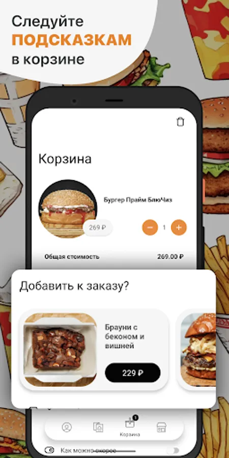 How to place an order in the "Daddy's Burgers" application: select the items you like from the menu, add them to the basket and proceed to the checkout screen (by clicking on the basket icon).