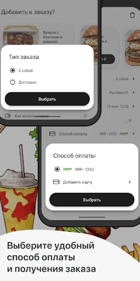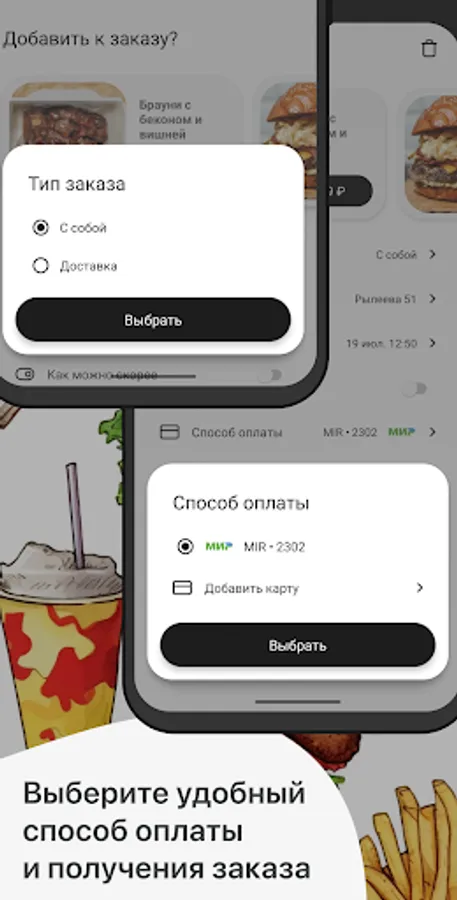 Specify the time when you want to pick up your order or select delivery with the time and address of delivery.