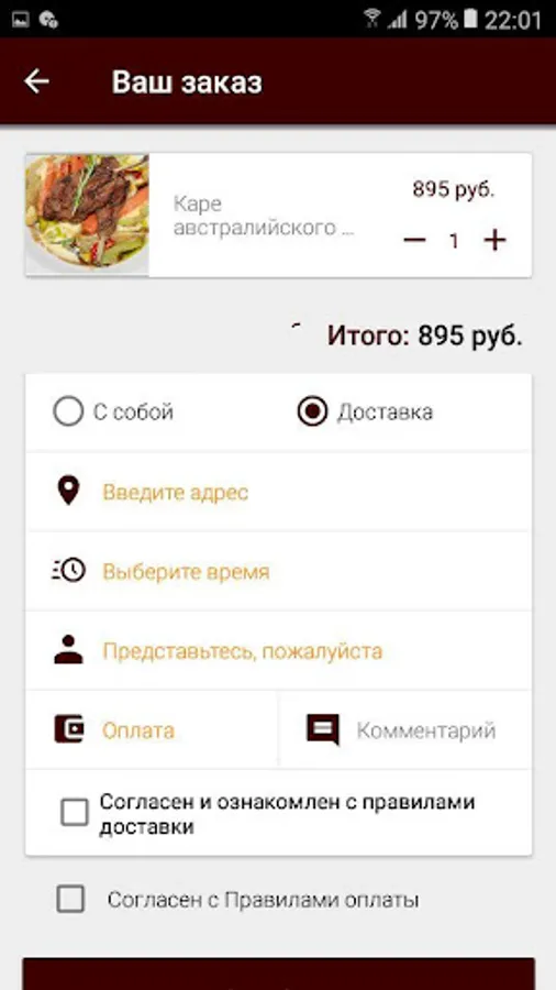 Specify the time when you want to come for your order or select a delivery with the time and the delivery address.