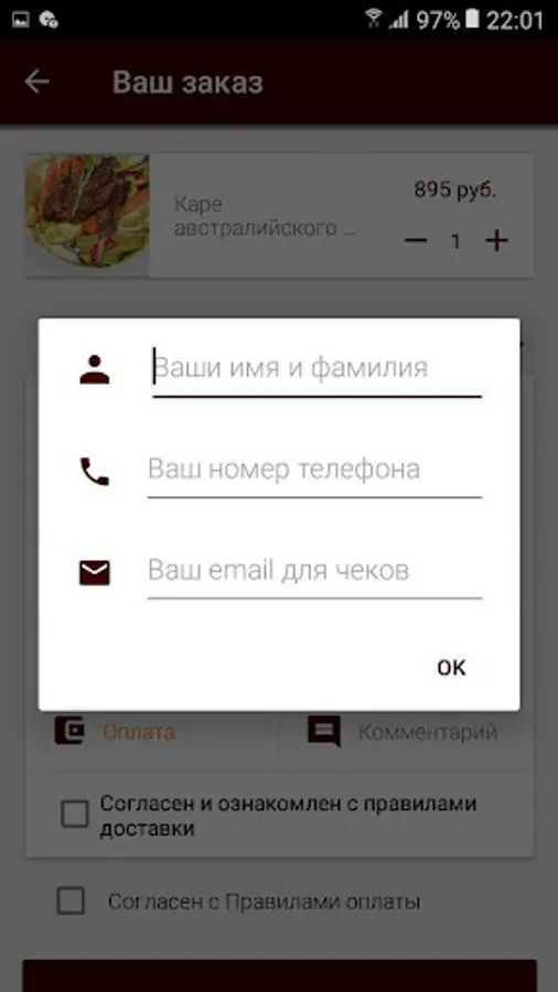 The screen of the order, add your contact information to the first order: Name, phone number and email address to be notified about the payment.