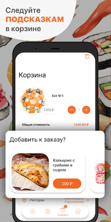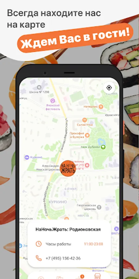 Mobile application "At night, eat" delivers hot delicious pizza for every taste, pasta, salads, a variety of Japanese dishes and drinks.