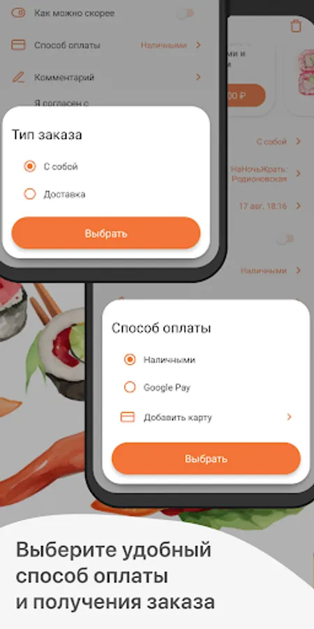 Specify the time when you want to come for your order or select a delivery with the time and the delivery address.