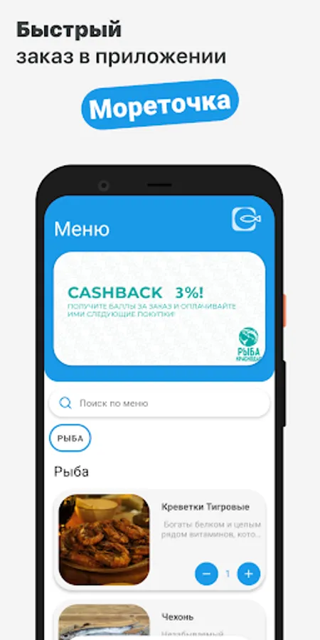 How to place an order in the Moretochka application: select the items you like from the menu, add them to the basket and go to the checkout screen (by clicking on the basket icon).