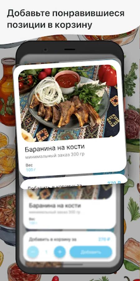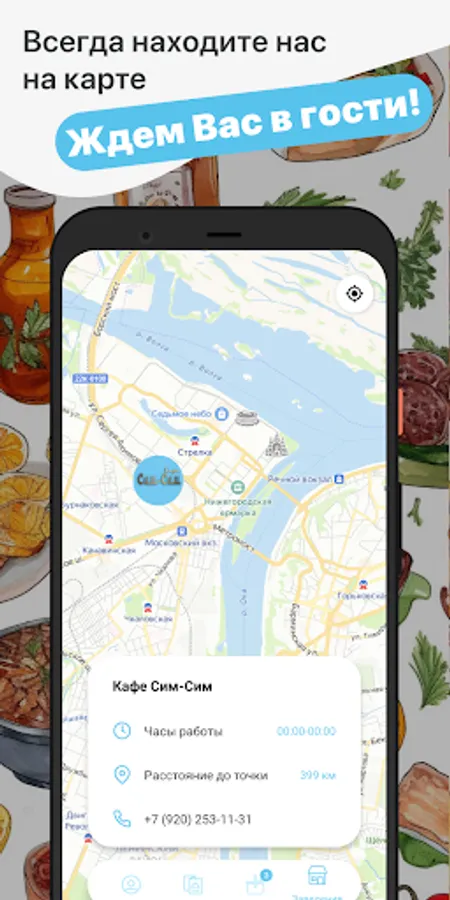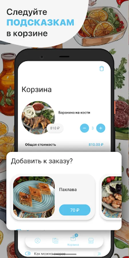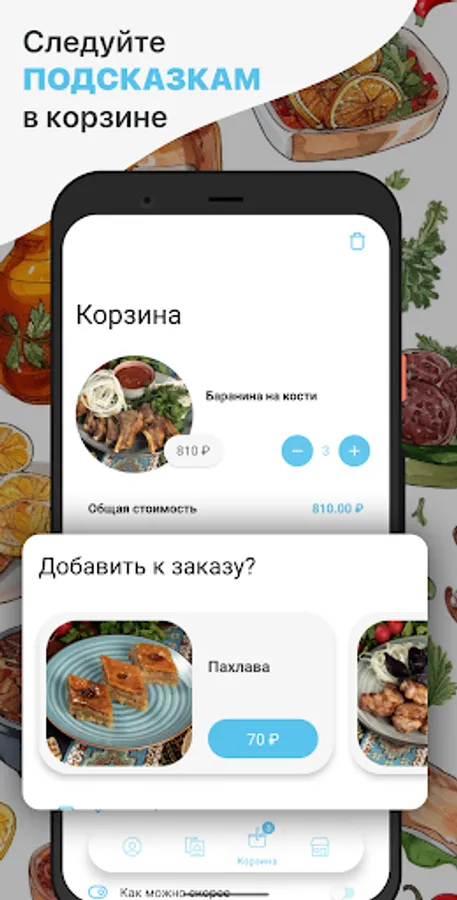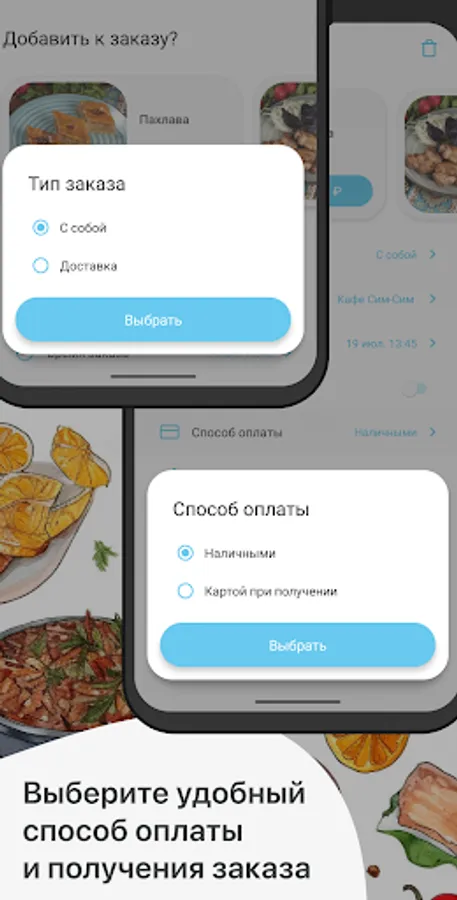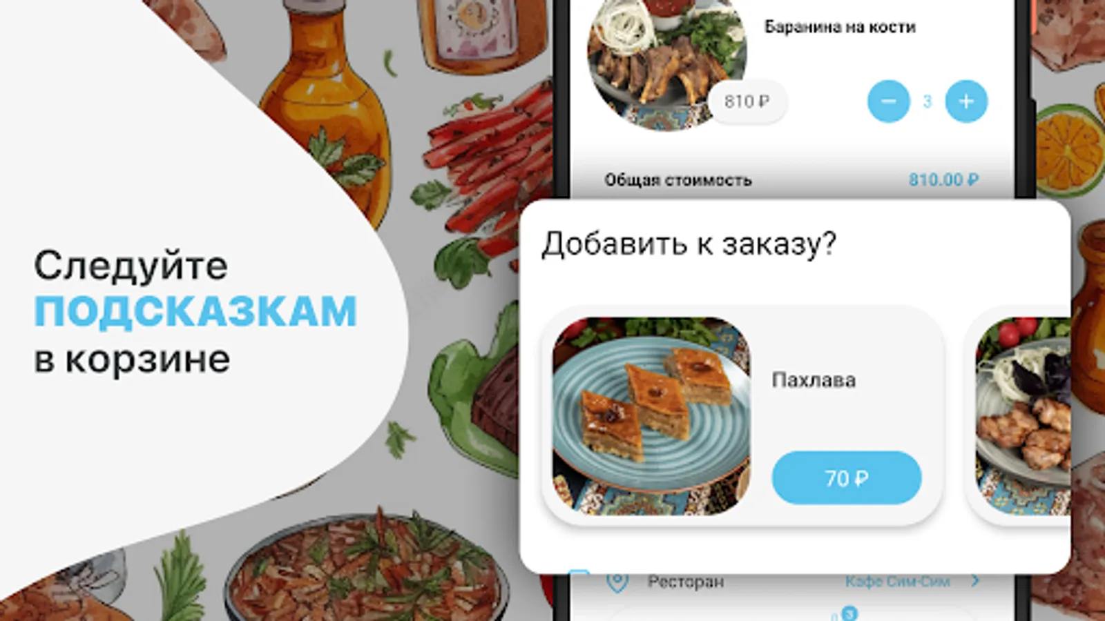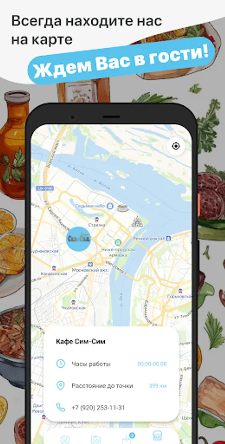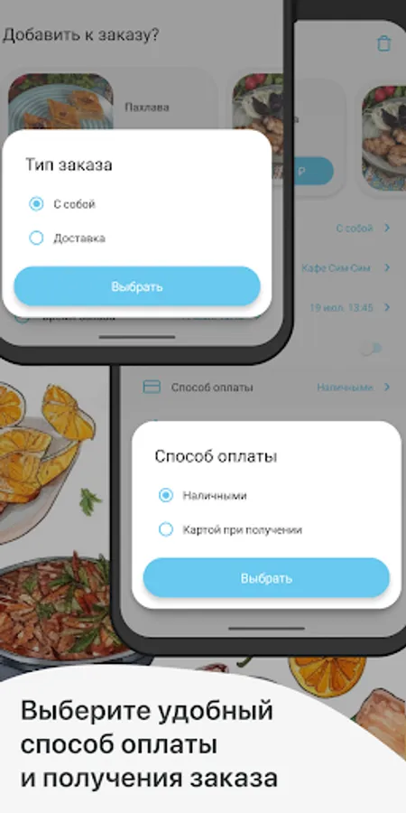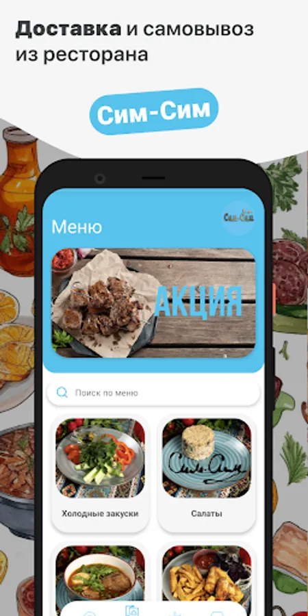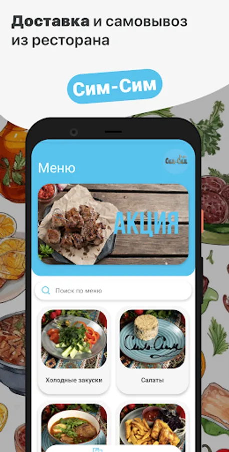 How to place an order in the Cafe Sim-Sim application: select the items you like from the menu, add them to the basket and go to the checkout screen (by clicking on the basket icon).