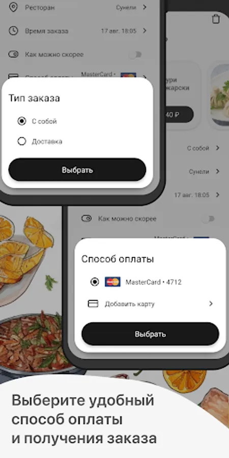 Specify the time when you want to come to pick up your order or select delivery with the indication of the time and delivery address.
