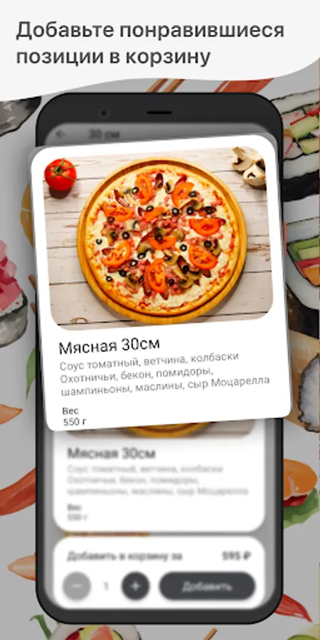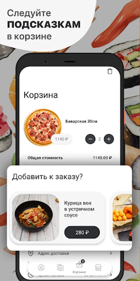 How to place an order in the Sushi Banda application: select the items you like from the menu, add them to the basket and go to the checkout screen (by clicking on the basket icon).