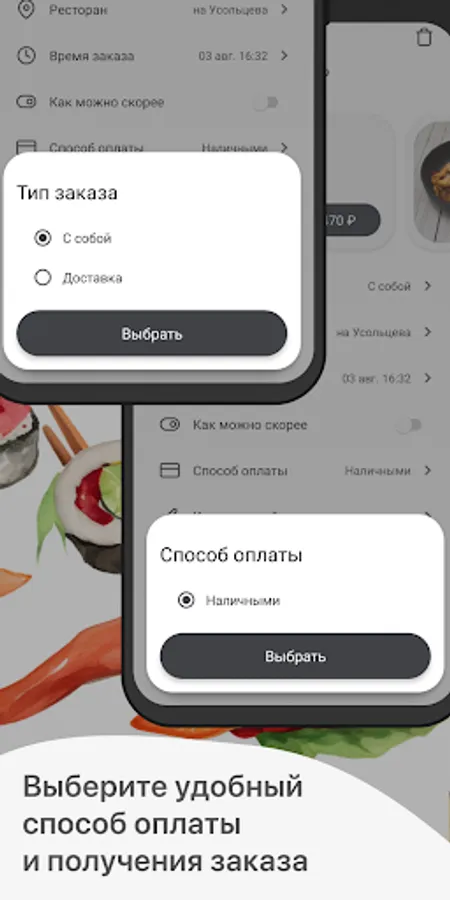 Specify the time when you want to pick up your order or select delivery with the time and address of delivery.