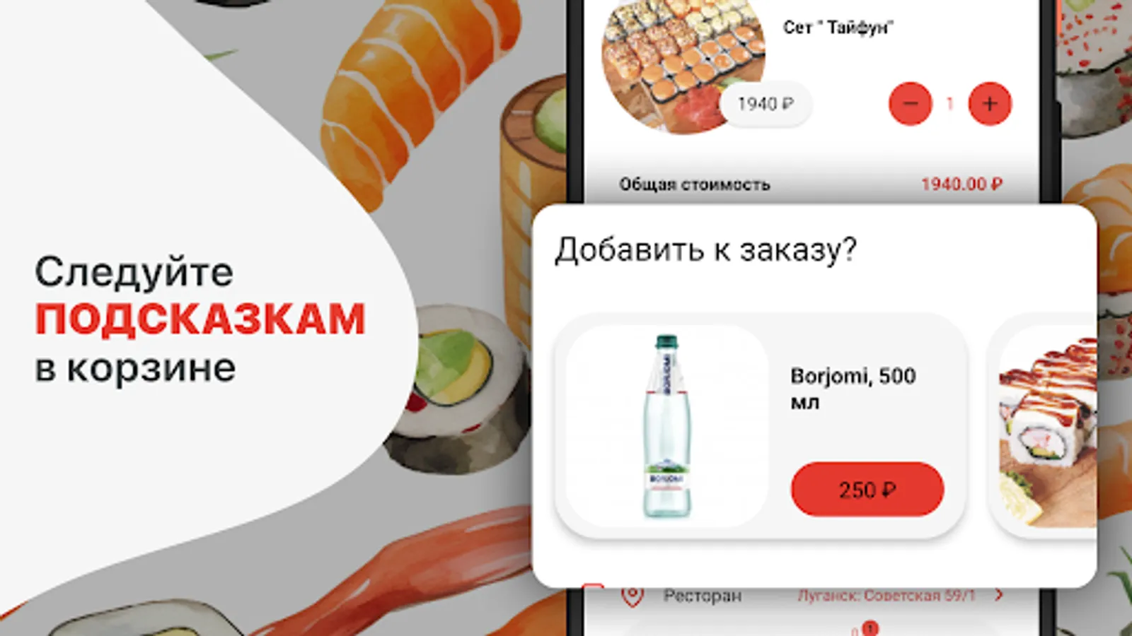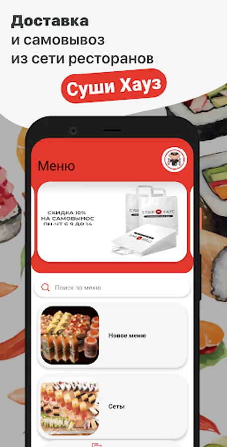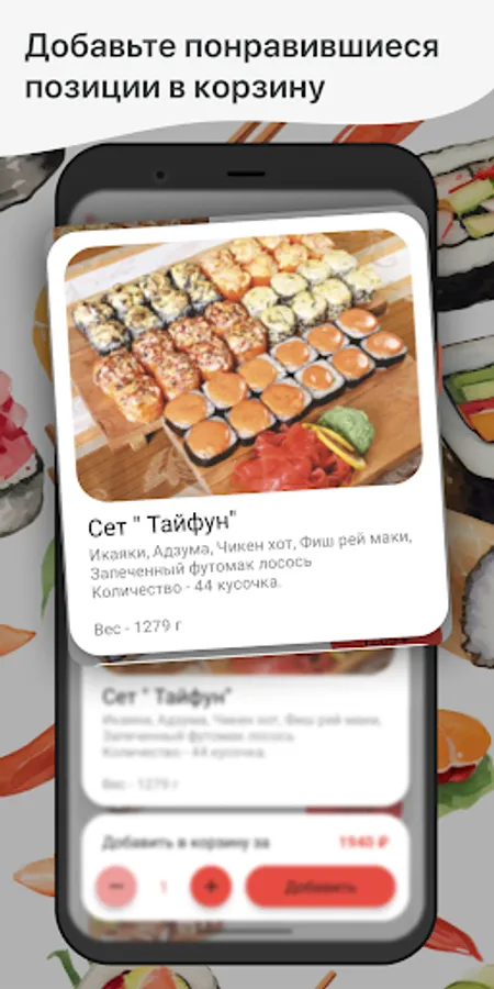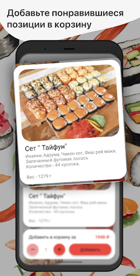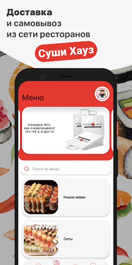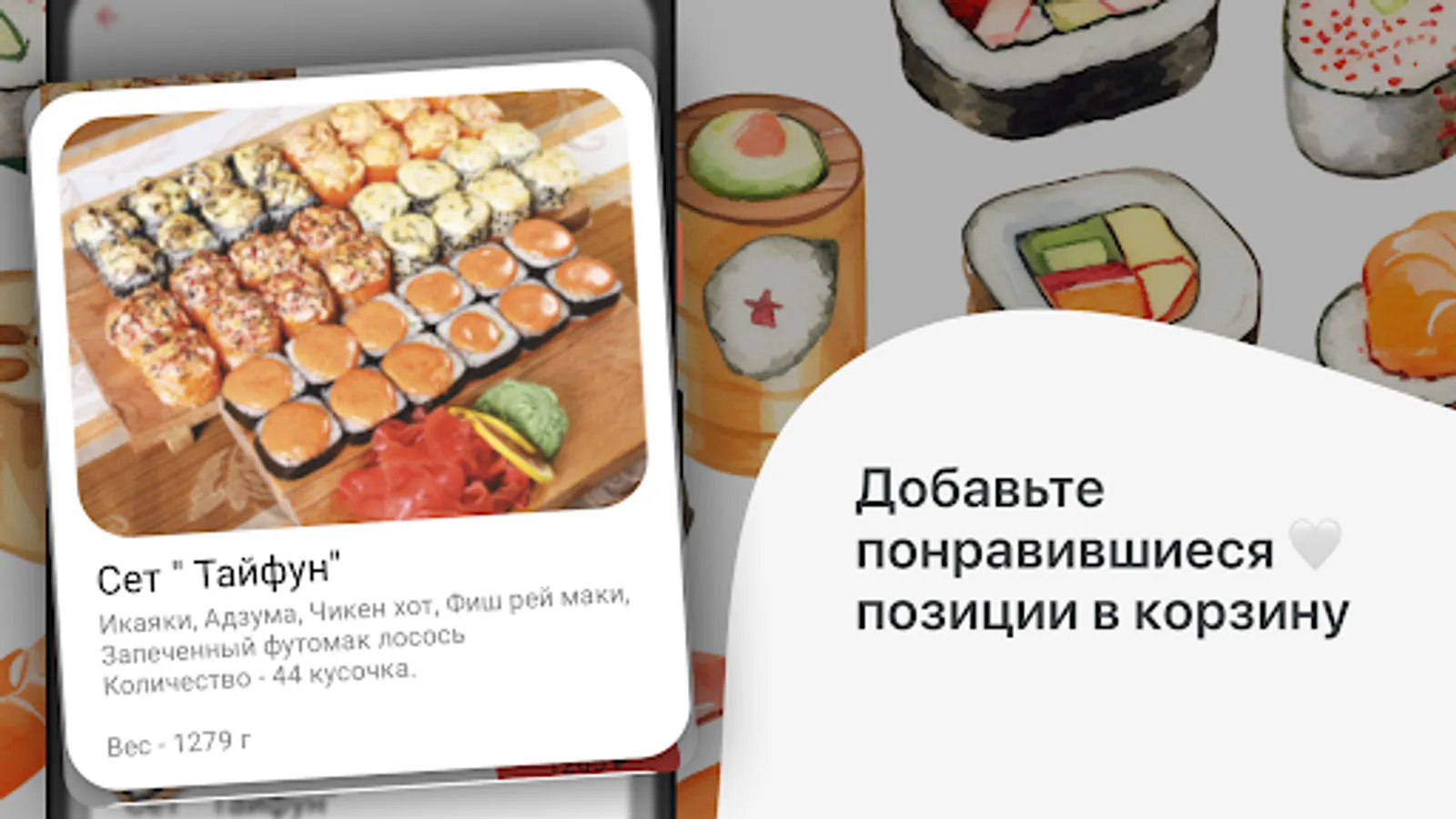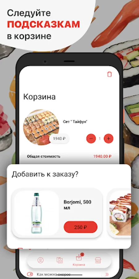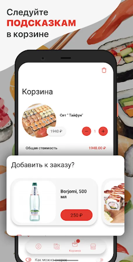 How to place an order in the “Sushi House” application: select the items you like from the menu, add them to the basket and go to the checkout screen (by clicking on the basket icon).