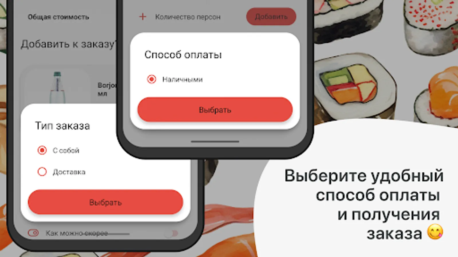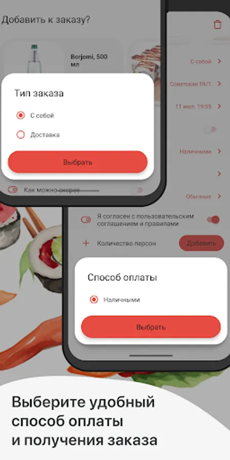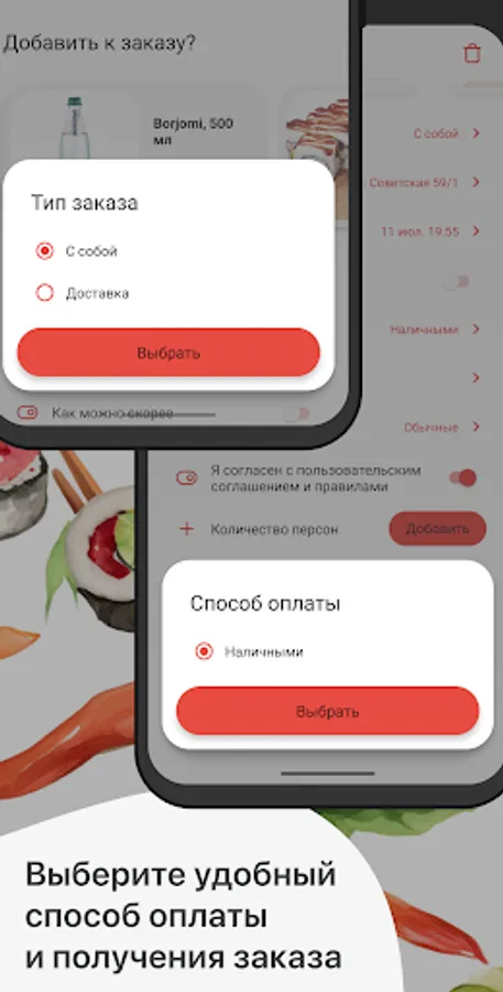 Specify the time when you want to pick up your order or select delivery with the time and address of delivery.