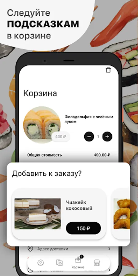How to place an order in the Sushi PakMan application: select the items you like from the menu, add them to the basket and go to the checkout screen (by clicking on the basket icon).
