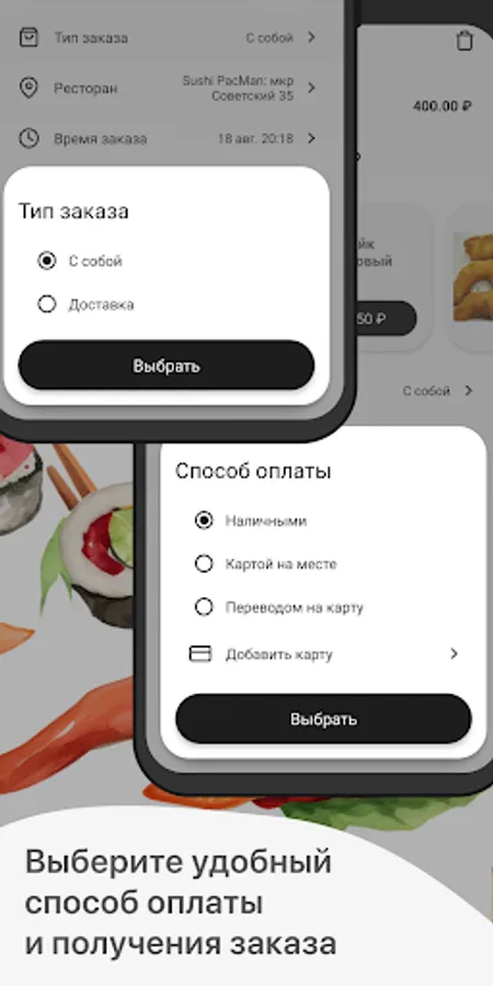 Specify the time when you want to pick up your order or select delivery with the time and address of delivery.