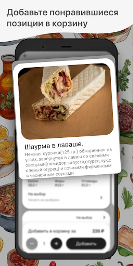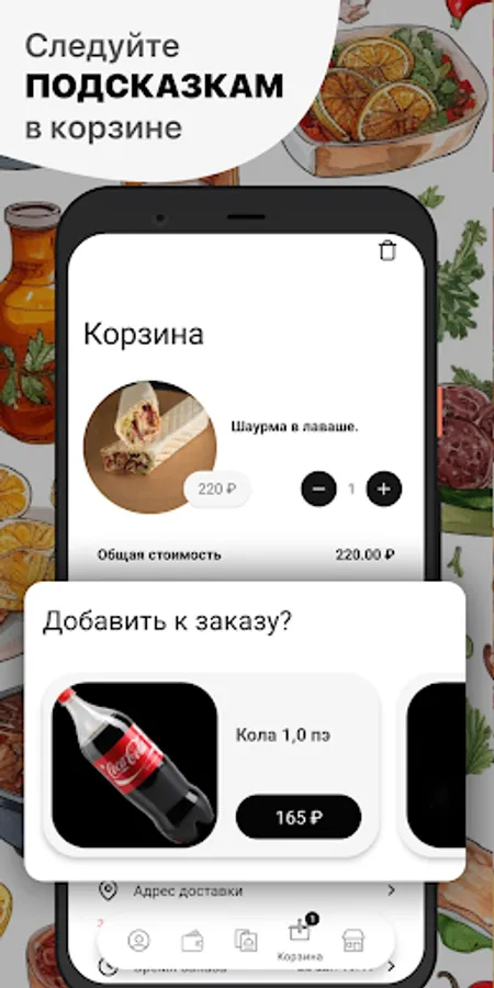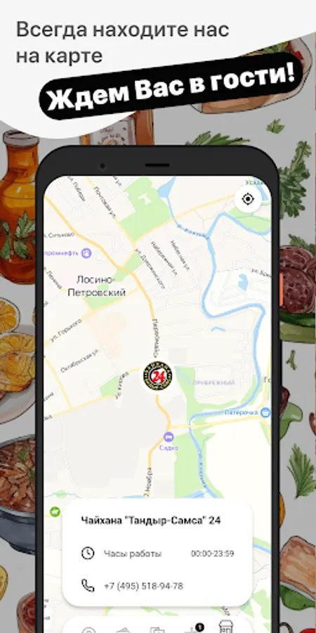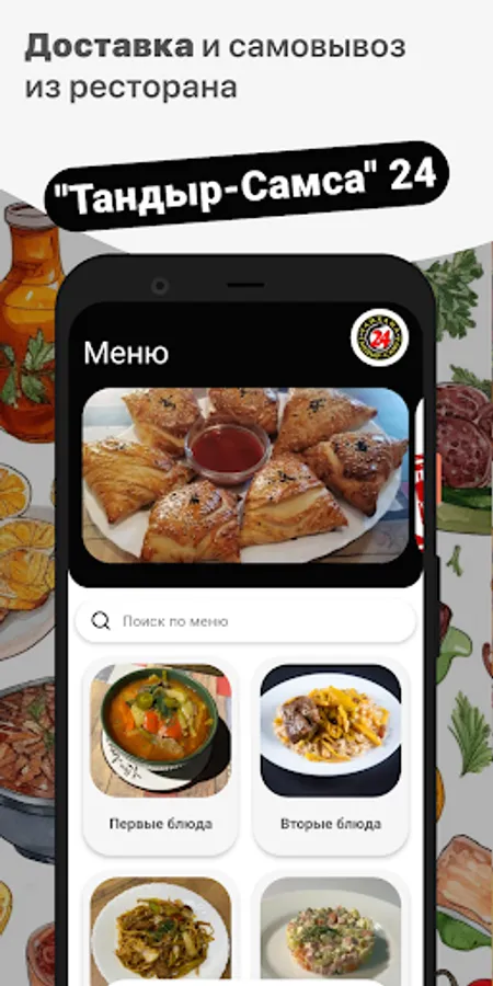How to place an order in the application “Teahouse "Tandyr-Samsa" 24”: select the items you like from the menu, add them to the basket and go to the checkout screen (by clicking on the basket icon).