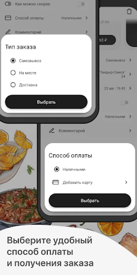 Specify the time when you want to pick up your order or select delivery with the time and address of delivery.