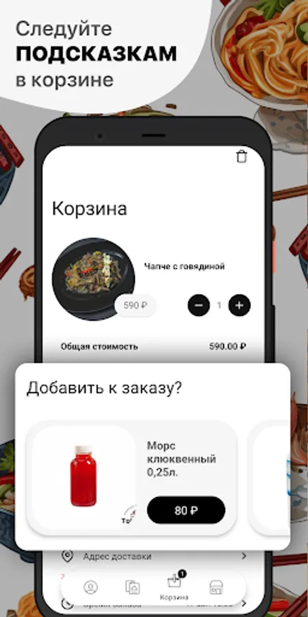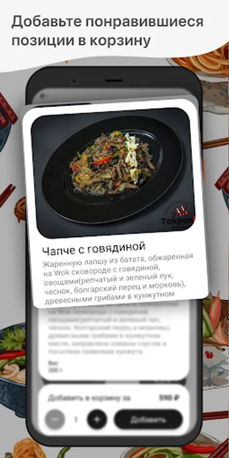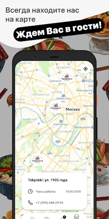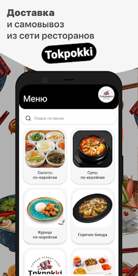 How to place an order in the “Tokpokki” application: select the items you like from the menu, add them to the cart and go to the checkout screen (by clicking on the cart icon).