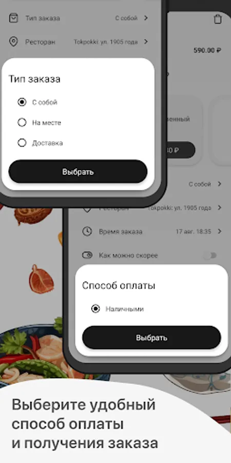 Specify the time when you want to come to pick up your order or select delivery with the indication of the time and delivery address.