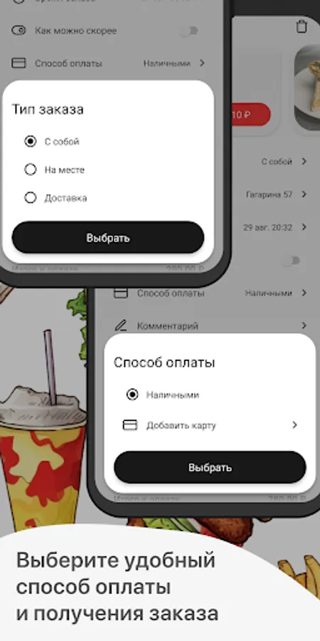 Specify the time when you want to pick up your order or select delivery with the time and address of delivery.