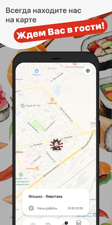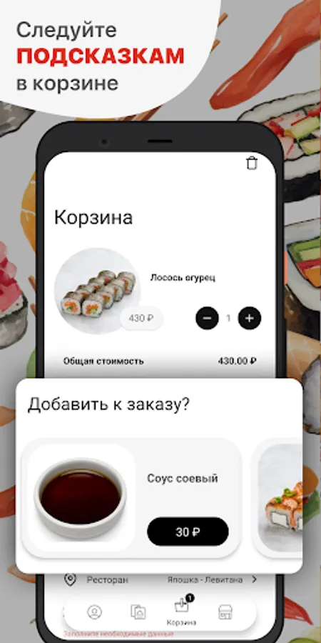 How to place an order in the Yaposhka application: select the items you like from the menu, add them to the basket and go to the checkout screen (by clicking on the basket icon).