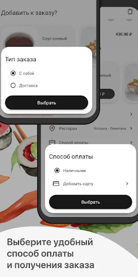 Specify the time when you want to pick up your order or select delivery with the time and address of delivery.