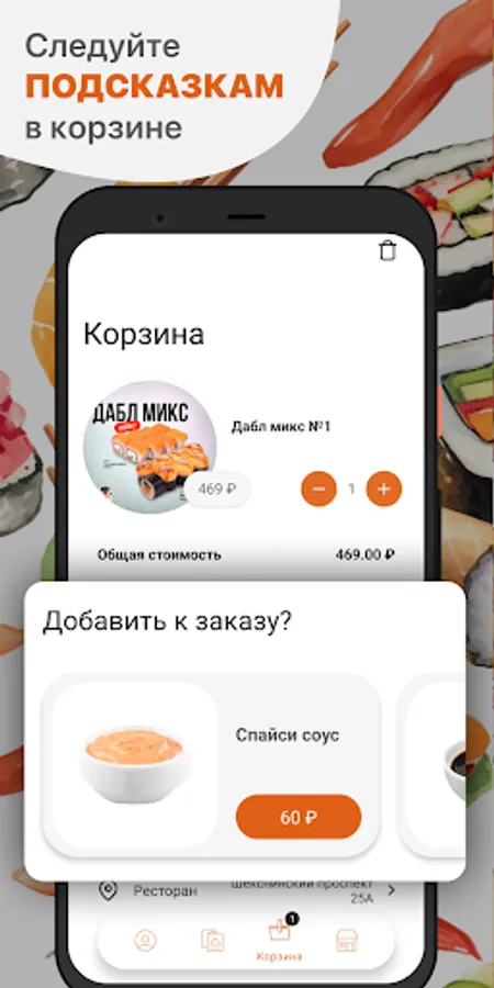 How to order in the “Yoko Sushi” application: select the items you like from the menu, add them to the cart and go to the checkout screen (by clicking on the cart icon).
