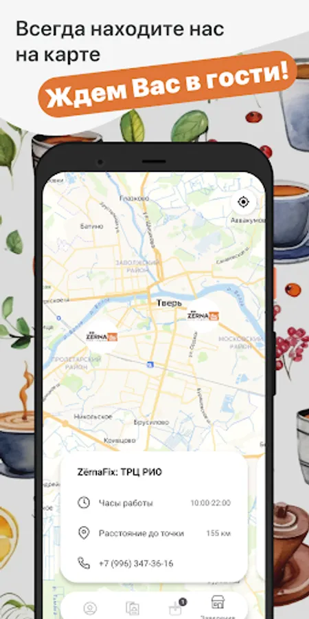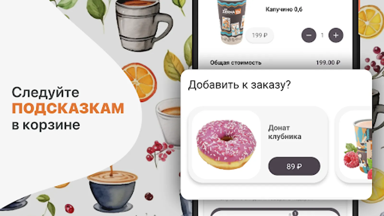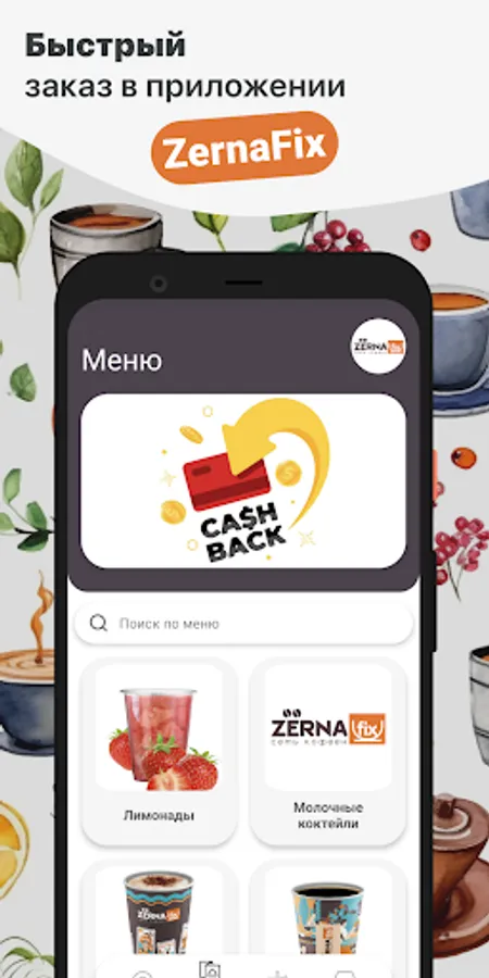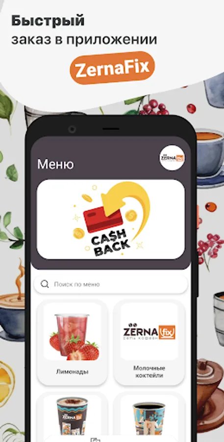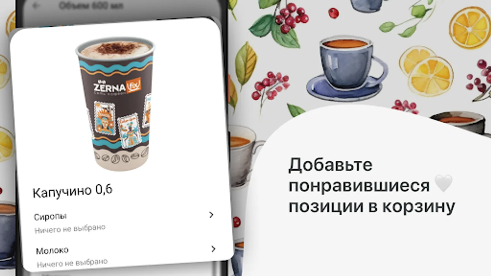 How to place an order in the “ZёrnaFix” application: select the items you like from the menu, add them to the basket and proceed to the checkout screen (by clicking on the basket icon).
