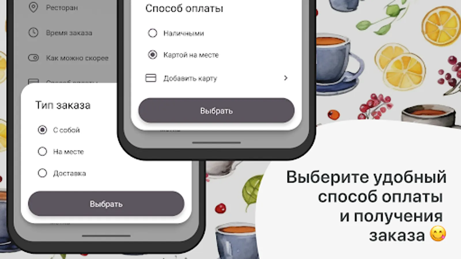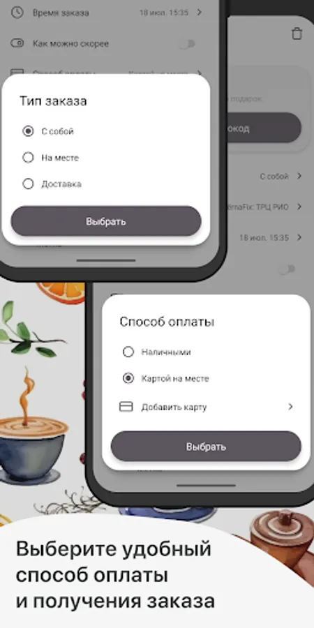 Specify the time when you want to pick up your order or select delivery with the time and address of delivery.