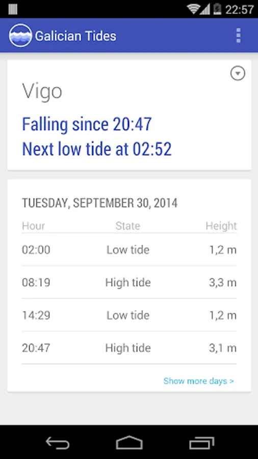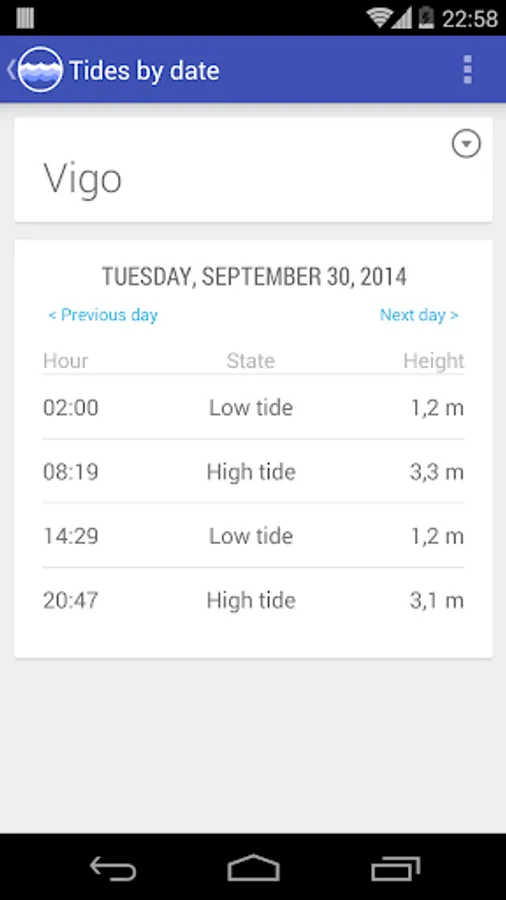 Galician Tides lets you get the current tide state from the main ports in Galicia. Daily tide table with time and height of high tides and low tides. Tidal information from past and future dates is also available.