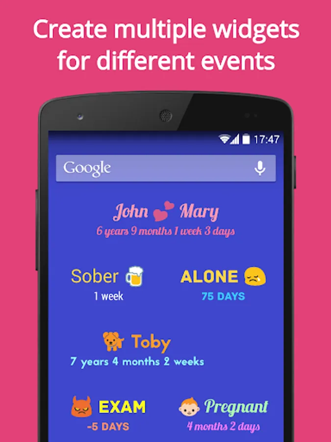 This widgets acts as a time counter. Set a title and the date of any event of your life. It will show how many years, months, weeks and days since (or to) that date.