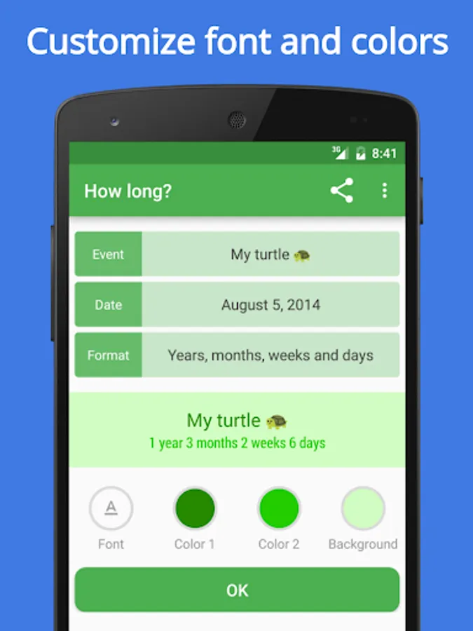 Tap any time on the widget to change its configuration. You can change typography, colors and the format of the period. You can also share the period through instant messaging or social networks.