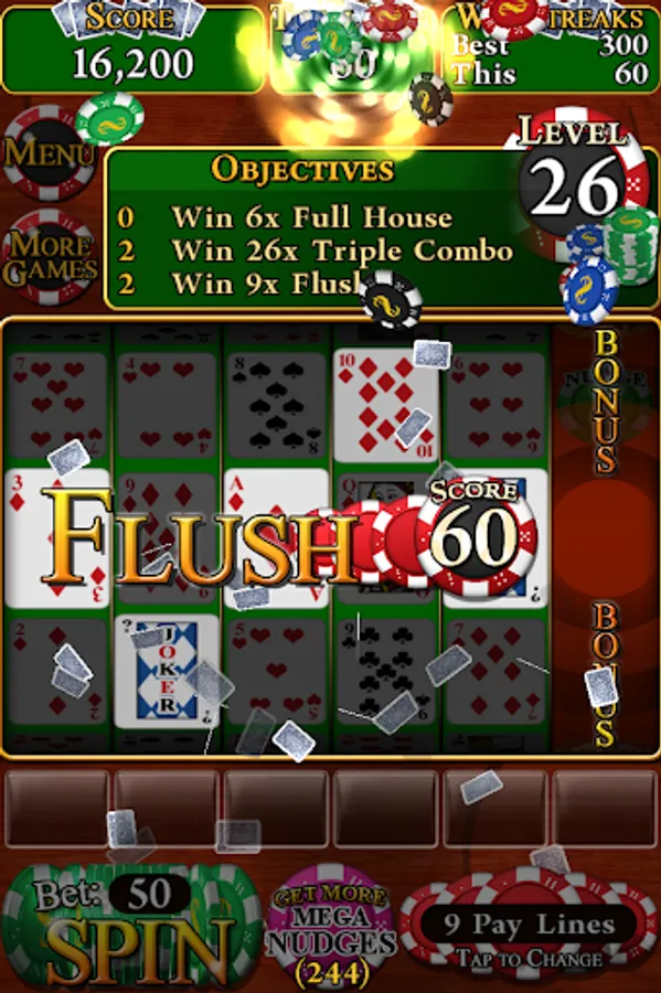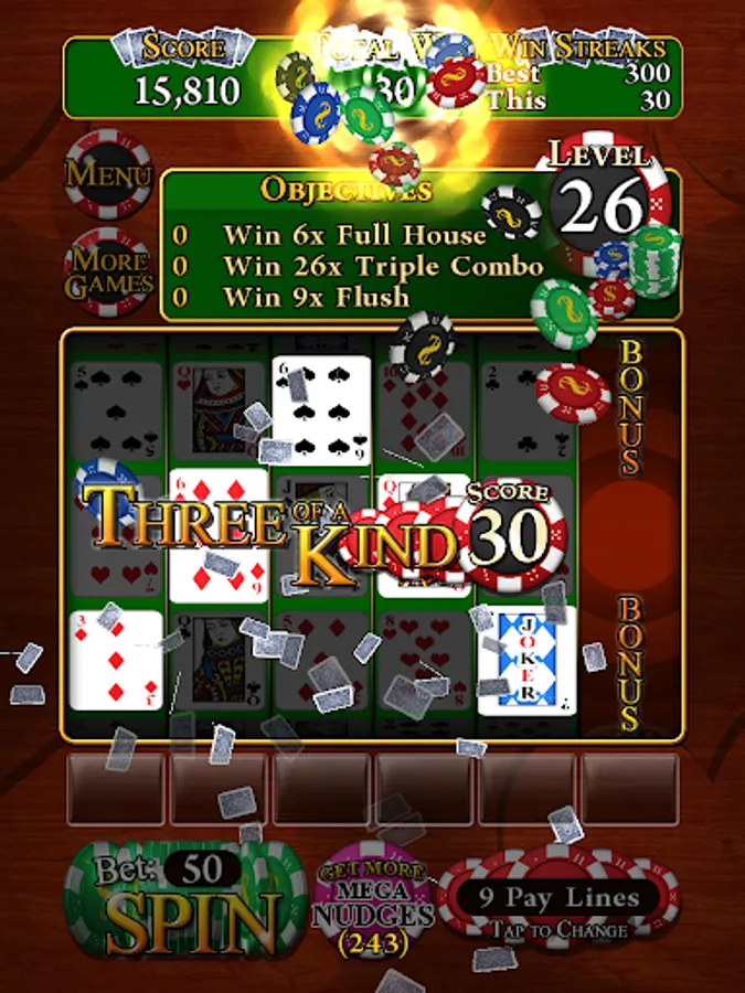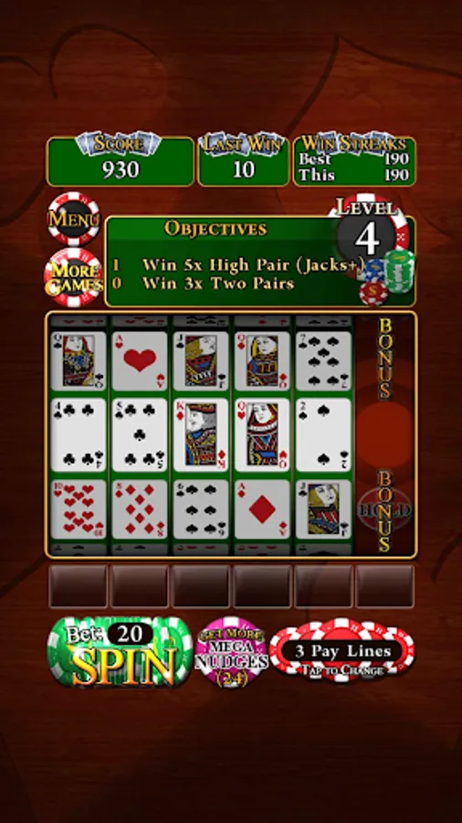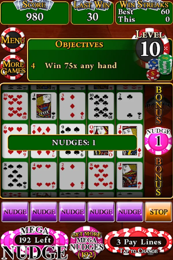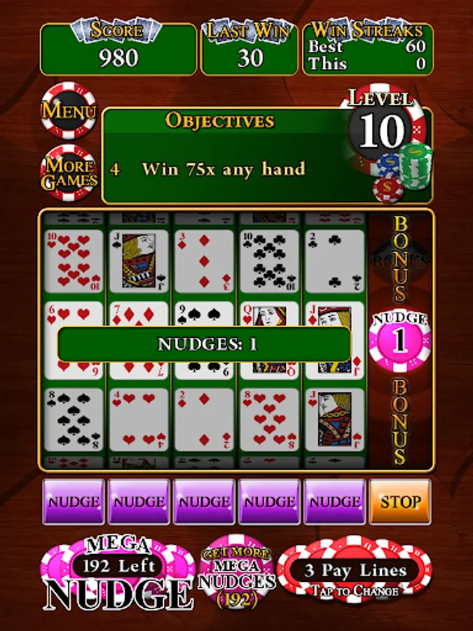 Stop the bonus reel on a nudge symbol, then nudge the reels to line up even better wins. Using your nudges to make an optimal win can be quite a challenge, especially when you take into account multiple pay lines and wild card jokers. Optimal play requires genuine skill and cunning.