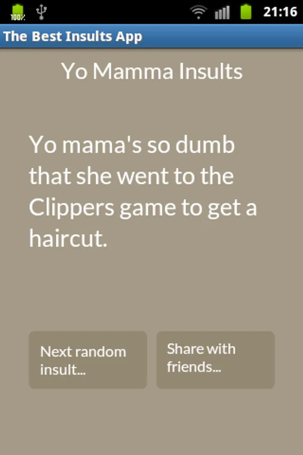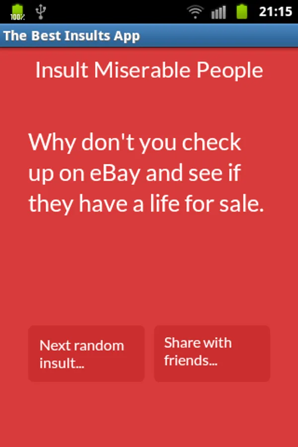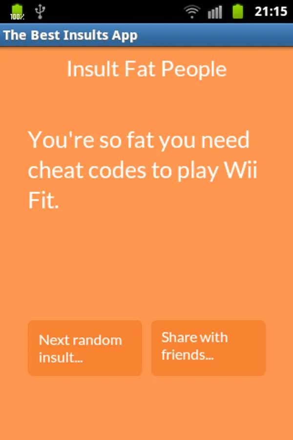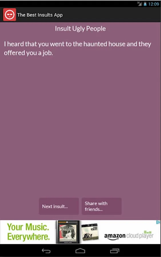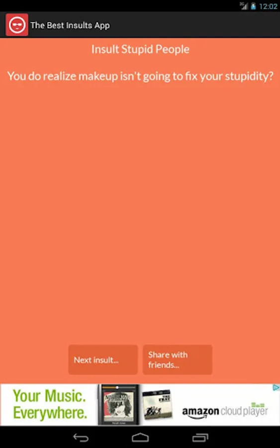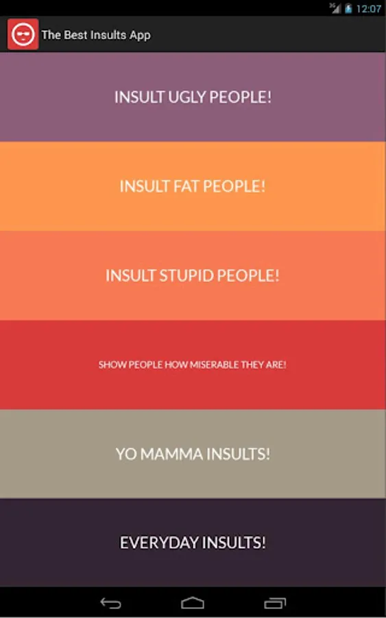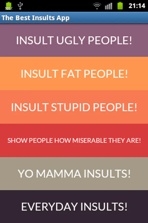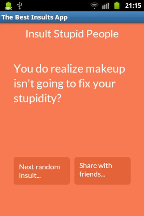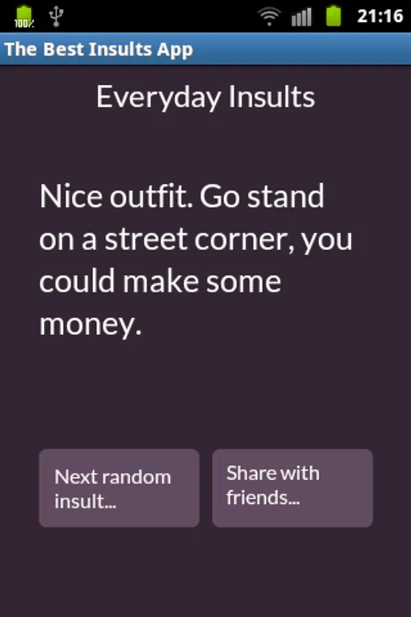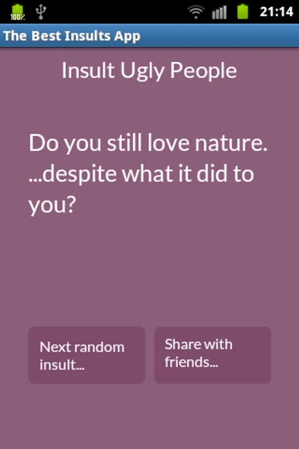 Have fun insulting your friends, enemies, or bullies! :-) The Insults App is made just for fun; we don't recommend offending anyone.