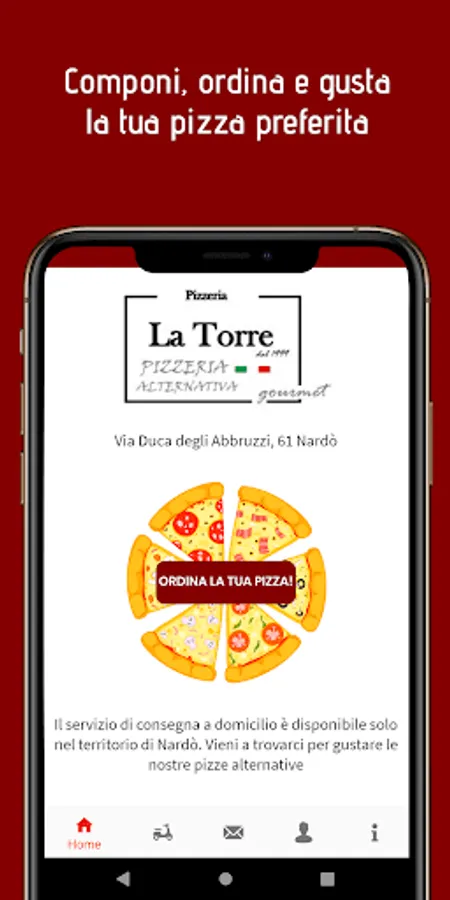 Your favorite pizza, directly to your home in the city of Nardò (LE). Download the free La Torre app and order your pizza. You choose it with the best alternative dough, gluten-free artisan dough, more side dishes and drinks.