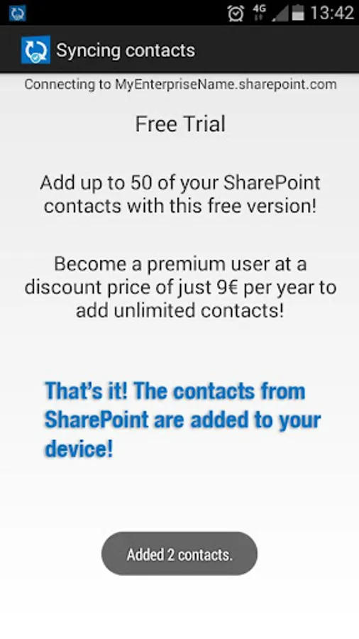 Add up to 50 of your SharePoint contacts with a free trial. Become a premium user (9€/per year) and add unlimited contacts!