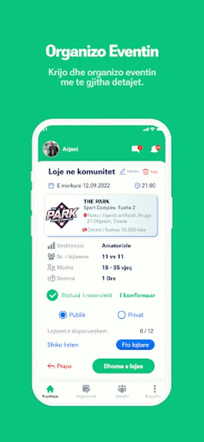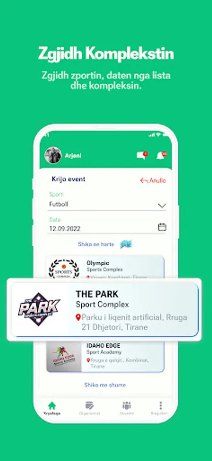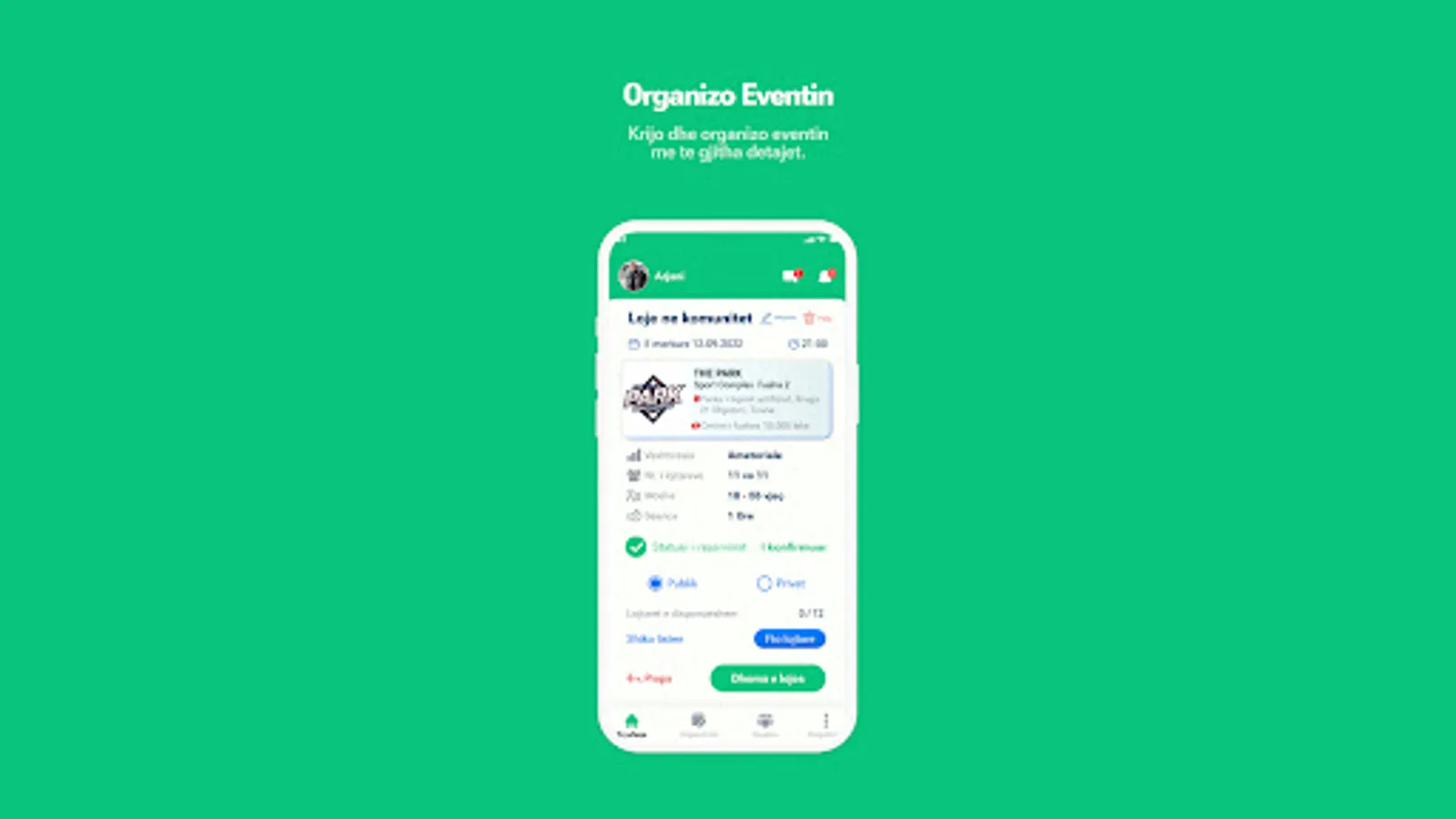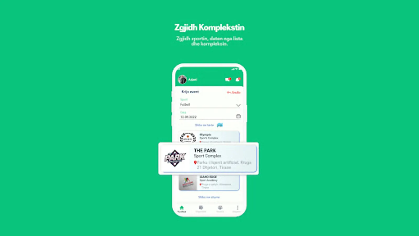 Sportisti ju ndihmon qe te rezervoni hapesiren tuaj ne komplekse dhe fusha te ndryshme sportive. Organizoni evente, krijoni skuadra, ftoni miq apo kerkoni lojtare qe te bashkohen ne evente publike ose behu pjese e tyre.