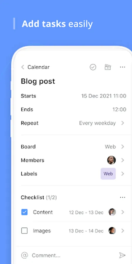 Create task lists as detailed as you need. Tie them to a project plan, set deadlines, and manage assignments all in one Trello app for Android.