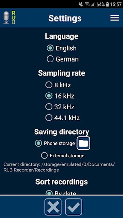 Mit dieser App können hochwertige WAV-Aufnahmen erstellt werden. Diese werden unter der Verwendung von nativen Bibliotheken erstellt, was eine Beeinflussung der Aufnahme durch mögliche Mikrofonsignal-Vorverarbeitungseffekte reduziert und aufgrund von geringer Latenz parallele Echtzeit-Anzeige der Spektralinformationen ermöglicht. Es können verschiedene Aufnahmequalitäten eingestellt werden. Die höchste angezeigte Frequenz entspricht jeweils der halben Abtastrate.