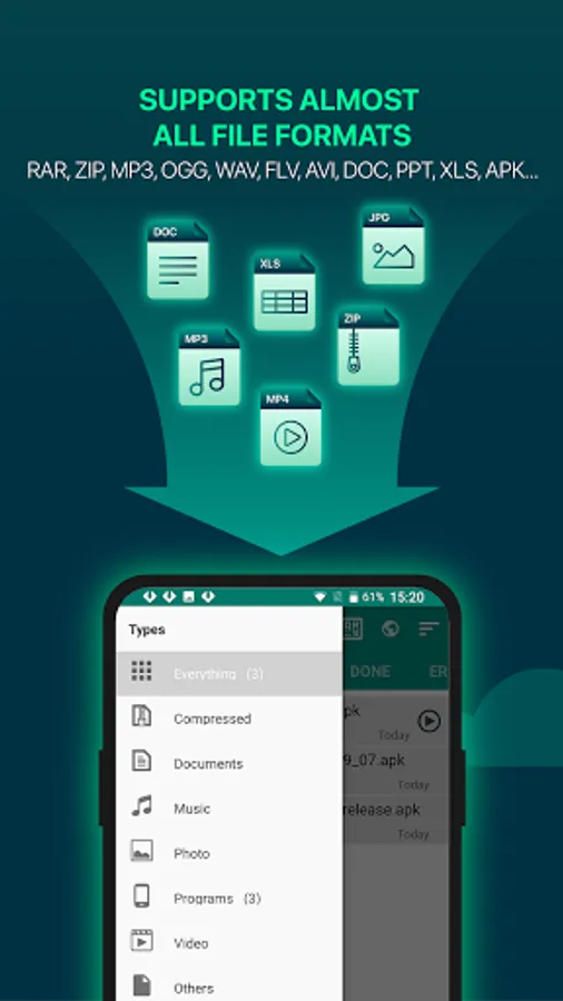 - Support all formats: archive files, MUSIC, VIDEO, documents, programs