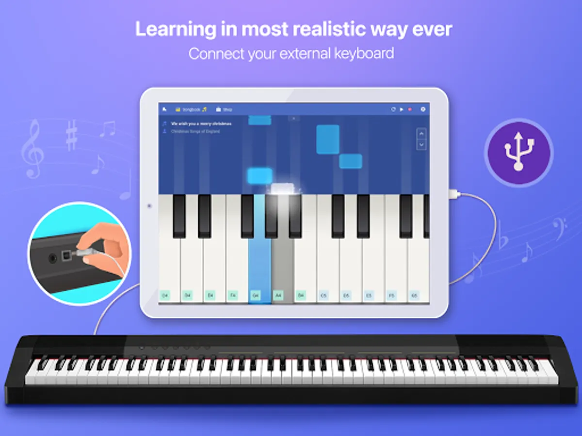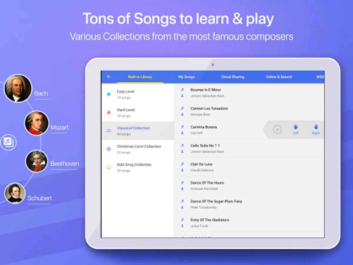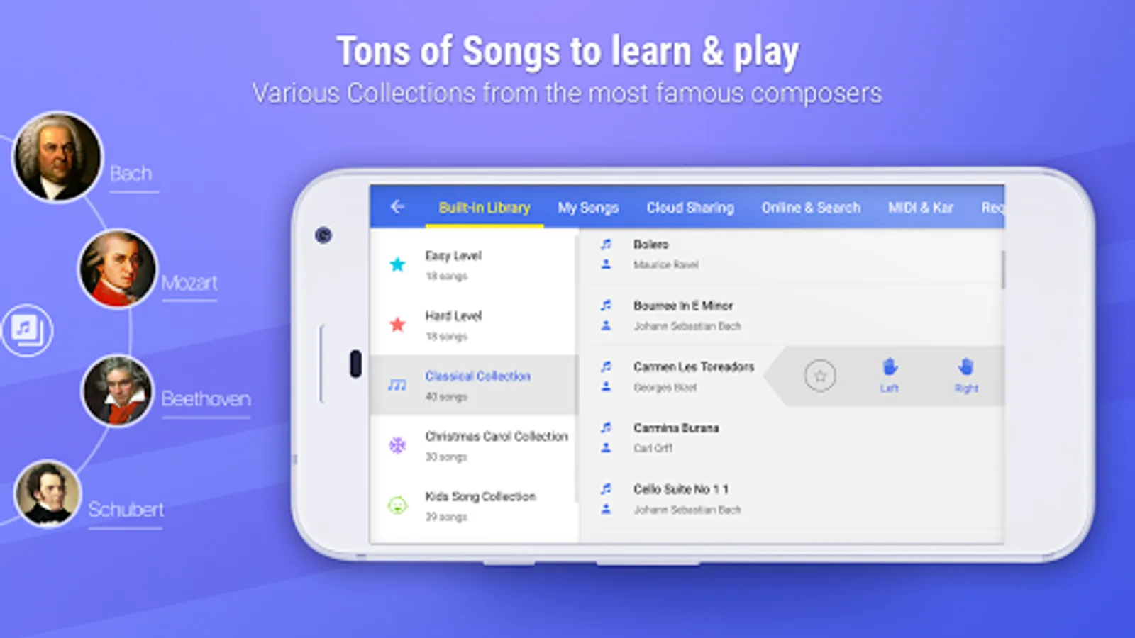 - Enjoying huge music library with lots of Classical piano songs, Kids song collection, pop, anime songs,…
