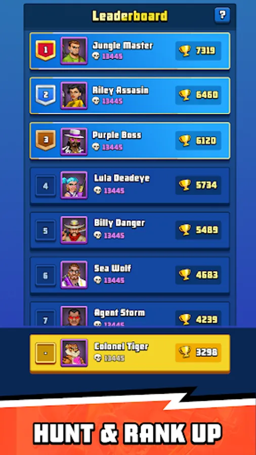 Rank up among players all over the world and climb to the top of the leaderboard. Invite and beat your friends, show them who is the best hunter!