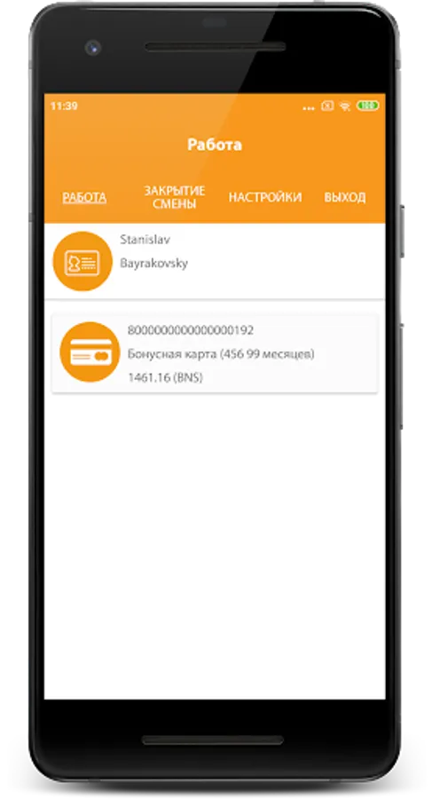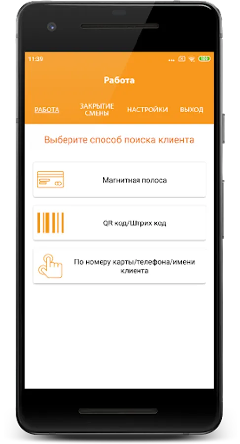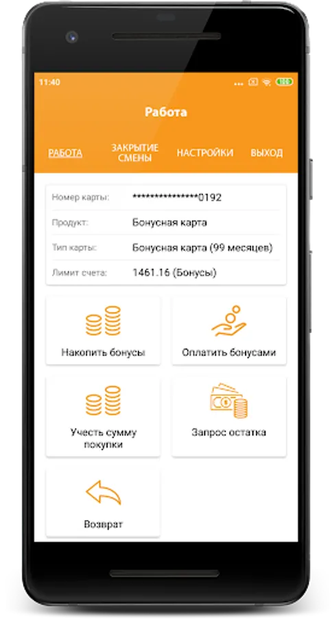 • Select the type of loyalty card service operation, depending on the type of card: bonus, discount, gift, design, the screen displays a different set of available operations, namely: