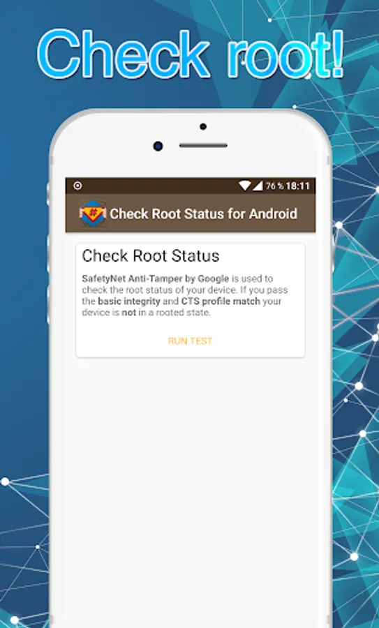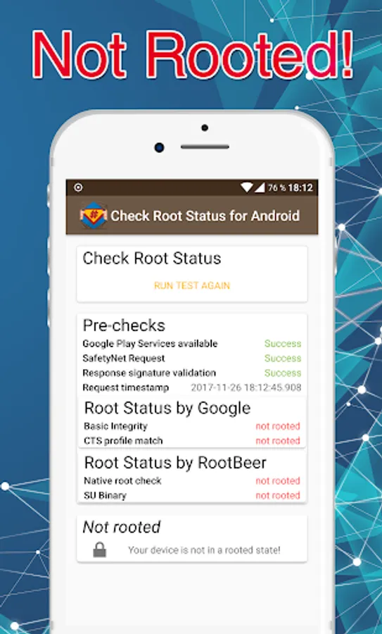 “Check Root Status for Android - with SafetyNet” is an easy to use root checking app that checks if your android device has su access. Knowing super user status of android can be done by running a simple test on the app. The app double checks root with SafetyNet API by Google and native root check.