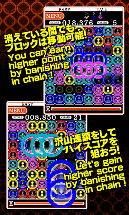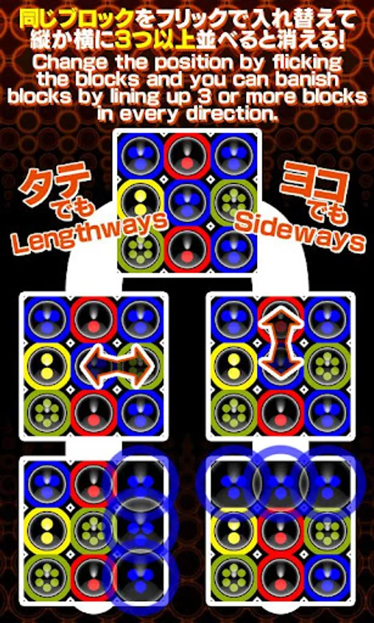 By flicking the same blocks, and arranging three or more vertically or horizontally eliminate the blocks.