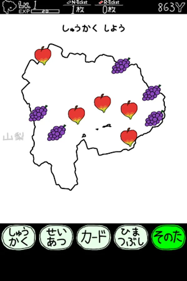 山梨の特産品を集め、各地を山梨にしたり、山梨の各市町村のカードを集めよう!