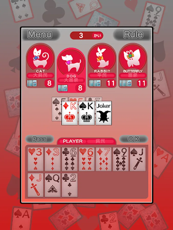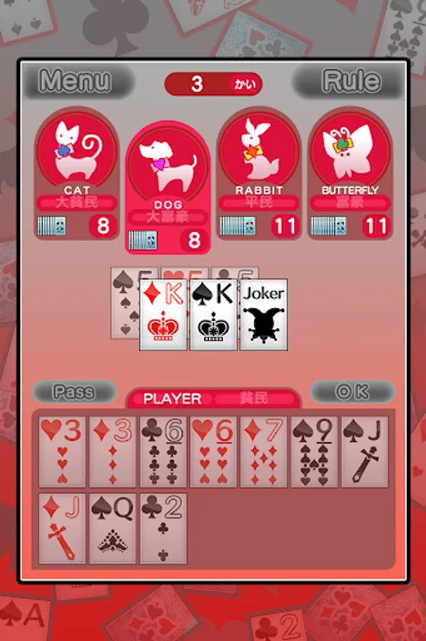 定番ゲームの大富豪が無料で遊べます。