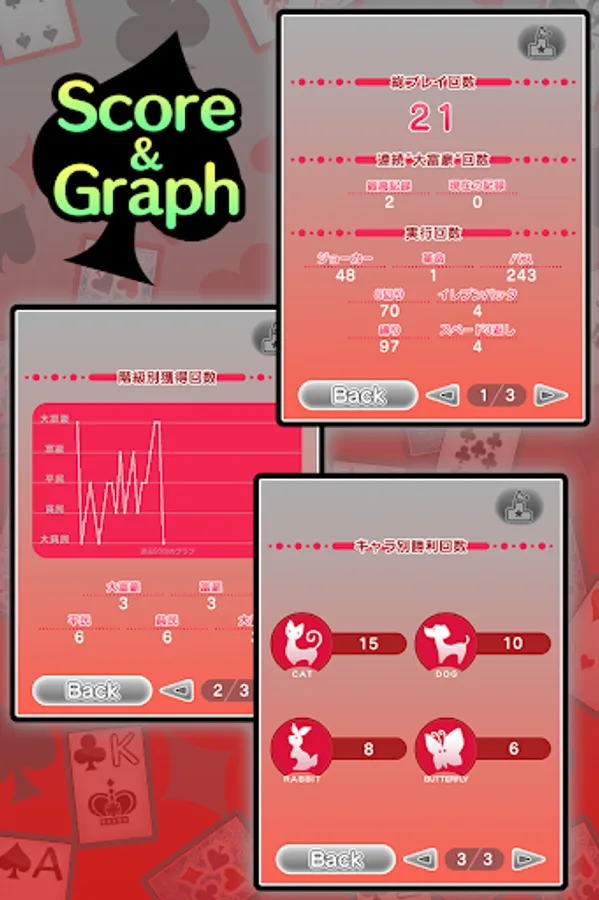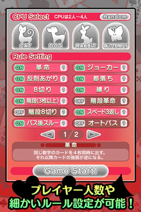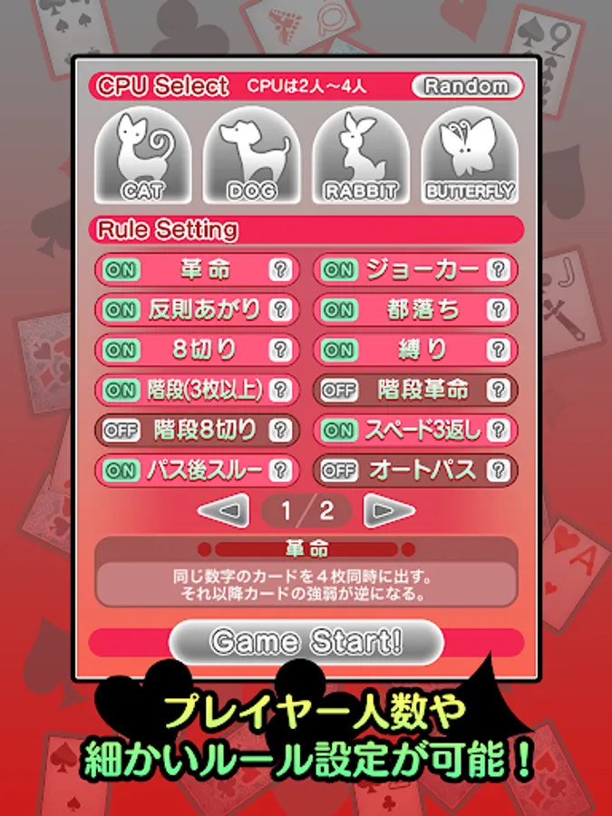 都落ち、8切り、縛り、階段(3枚以上)、階段革命、階段8切り、スペード3返し、イレブンバック、連番縛り、4切り、5スキップ、7渡し、9リバース、99車、クーデター、10捨て、Qリバース、Kスキップなどのルールを収録しています。