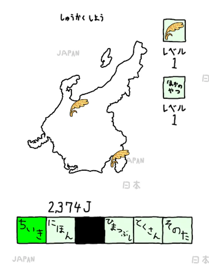 ・特産品のLVを上げると、収穫時のJ(JAPAN)が増えます。